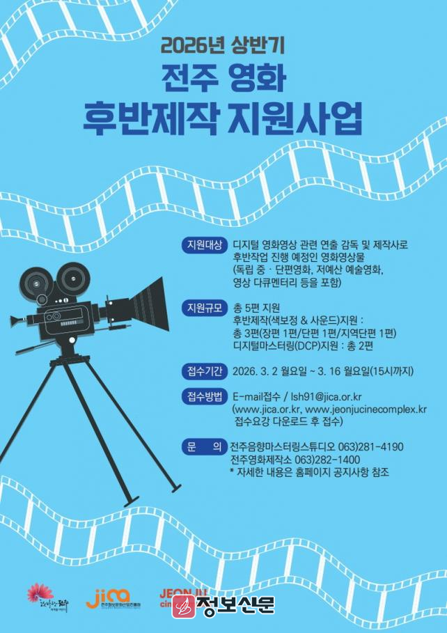 (재)전주정보문화산업진흥원(이하 진흥원, 원장 허전)과 전주영화제작소는 오는 3월 16일까지 대한민국 독립영화 제작 환경개선과 우수 작품을 발굴하기 위한 ‘2026년 상반기 전주 영화 후반제작지원 사업’에 참여할 작품을 공개 모집한다고 23일 밝혔다.