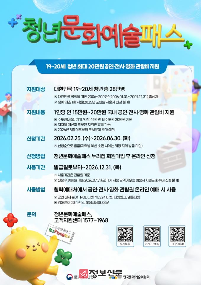 신청은 오는 2월 25일(수) 오전 10시부터 ‘청년문화예술패스 누리집’에서 온라인으로 가능하며, 발급받은 포인트는 협력 예매처에서 공연 및 전시 티켓 예매 시 즉시 사용할 수 있다.