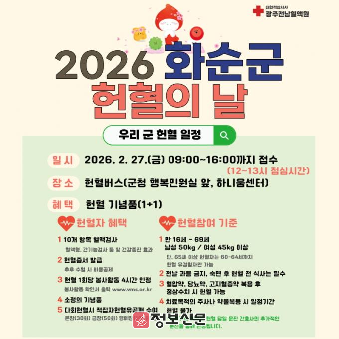 ![]() 화순군, 동절기 생명나눔 ‘사랑의 헌혈’ 실시 |