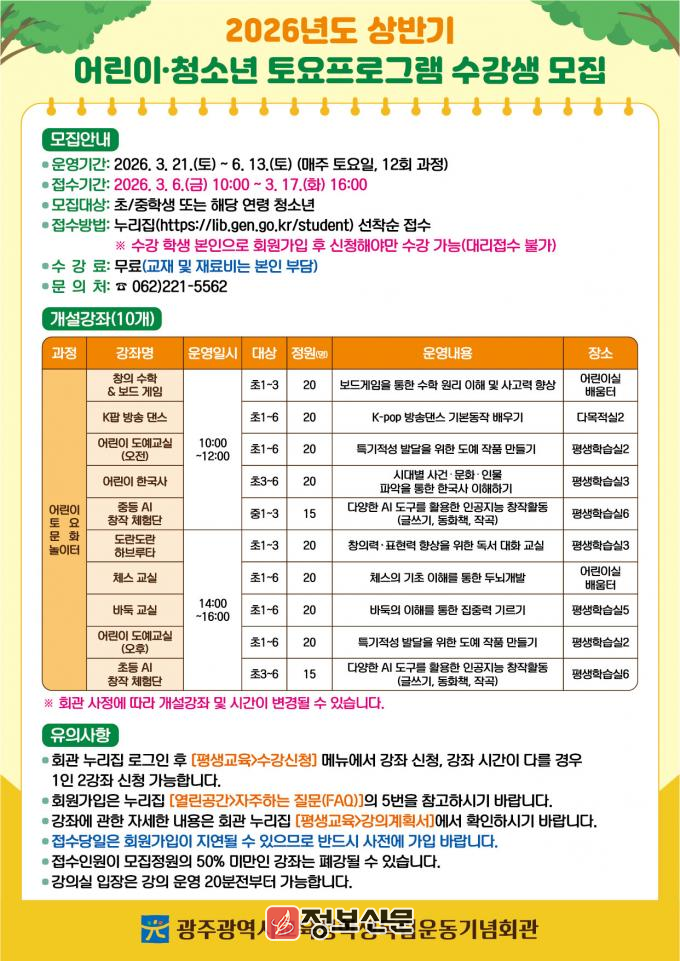 어린이·청소년 토요프로그램은 ▲어린이 한국사 ▲창의수학&보드게임 ▲AI창작 체험단 등 10개가 개설돼 오는 3월 21일부터 6월 13일까지 매주 토요일 2시간씩 총 12회 진행된다.