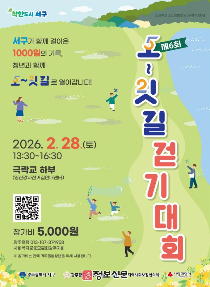 서구는 오는 28일 오후 1시30분 극락교 하부(서창둑길 377) 일대에서 제6회 ‘함께 서구 오~잇길 걷기대회’를 개최하고 가족돌봄청년을 위한 지역사회의 응원과 참여를 이어갈 예정이다.