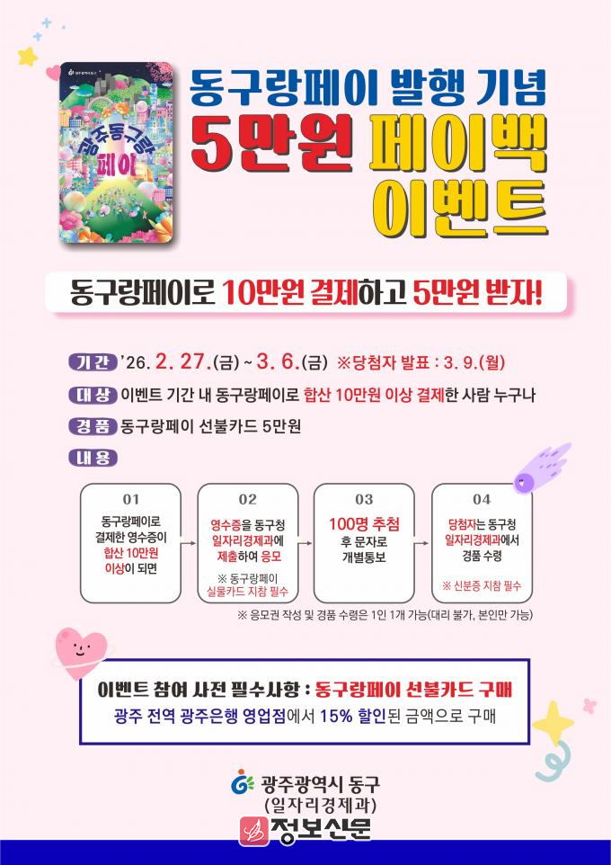 한편 동구랑페이 선불카드는 지난 23일 발행을 시작했으며, 광주 전역 광주은행 영업점에서 15% 할인된 금액으로 구매할 수 있다. 동구는 이번 페이백 이벤트가 지역경제 활성화에 긍정적인 효과를 가져올 것으로 기대하고 있다.