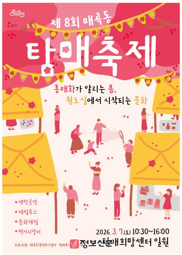올해 순천시 첫 축제의 시작을 알리는 이번 탐매축제는 ‘붉게 피어난 홍매화 아래, 문화의 봄이 시작되는 탐매축제’를 콘셉트로 원도심 매곡동의 지역 특색을 살린 세대공감 문화콘텐츠를 선보인다. ▲다양한 체험 프로그램을 통해 오감으로 봄기운을 느끼는‘감각’ ▲홍매화와 어우러져 ‘감동’을 더할 공연 ▲홍매화 아래 잠시 머물며 쉼과 여유를 누릴 수 있는 힐링 공간을 통한 ‘치유’를 담아, 축제를 찾은 시민과 관광객 모두가 보고, 듣고, 느끼며 즐기는 봄날의 추억을 선사할 예정이다.