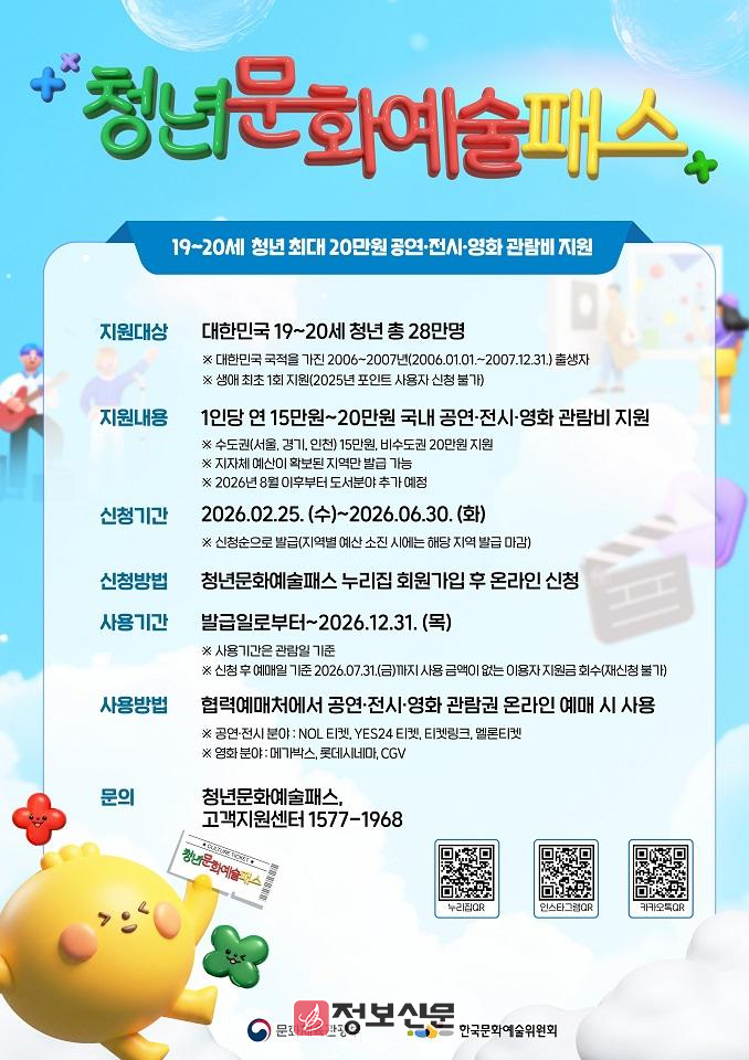 신청기간은 2월 25일부터 6월 30일까지이며, 청년문화예술패스 누리집(www.youthculturepass.or.kr)에서 가능하다. 지원금은 올해 말까지 사용할 수 있으나, 7월 31일까지 이용 내역이 없을 경우 자동 회수되므로 유의해야 한다.