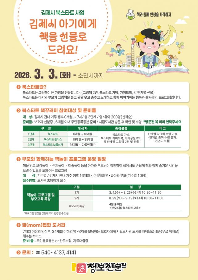 ![]() 김제시립도서관, 2026년 북스타트 책꾸러미 배부 사업 운영 |