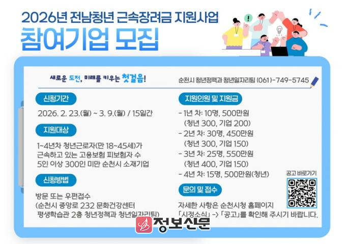 ![]() 순천시, 청년 근속장려금 참여 기업 모집 |