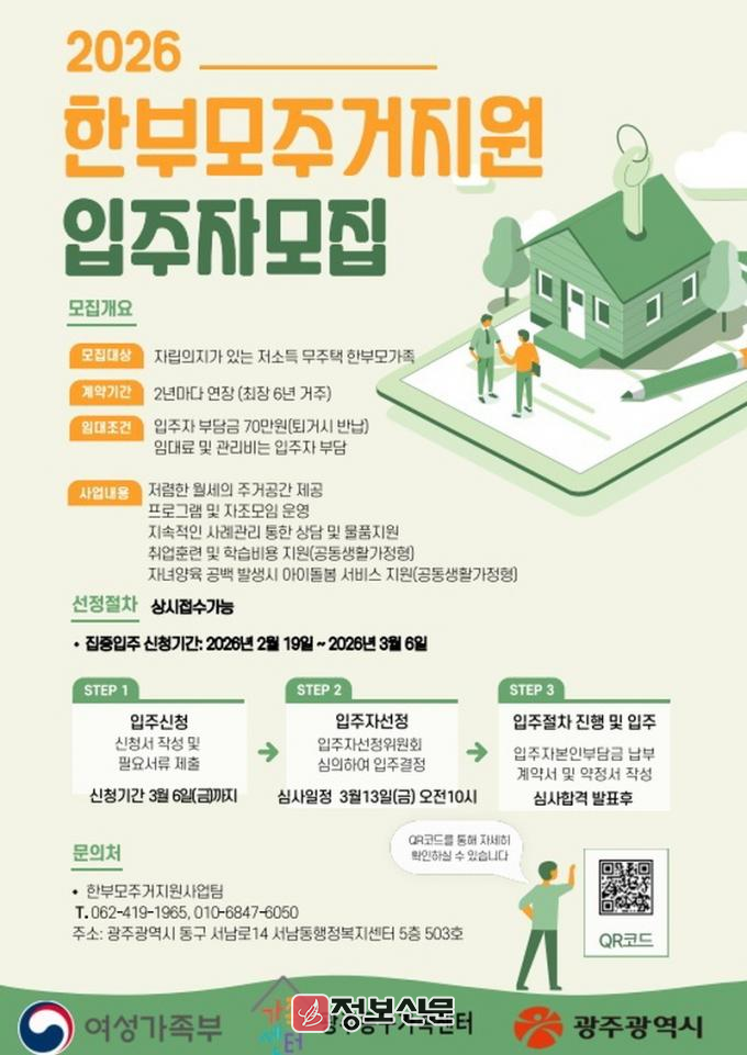 ![]() 광주광역시, 무주택 한부모가족 주거 지원사업 입주자 모집 |