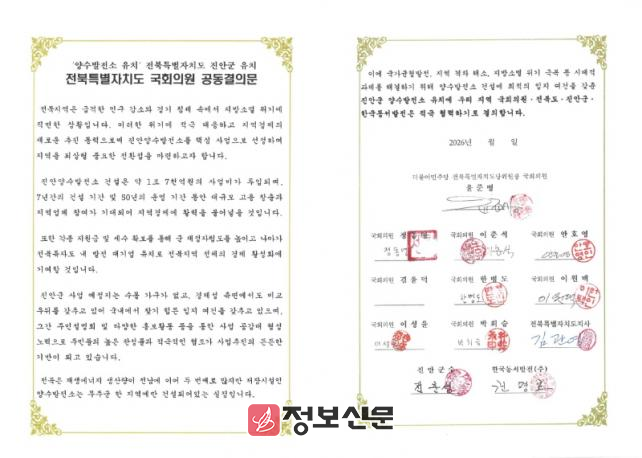 진안군 관계자는 “양수발전소 유치는 진안군을 넘어 전북 전체의 미래 경쟁력과 직결된 과제”라며 “전북특별자치도와 지역 국회의원들이 함께 뜻을 모아 공동서명으로 이어졌다는 것은 전북이 하나의 팀으로 움직이고 있다는 상징적인 의미를 갖는다”고 밝혔다.