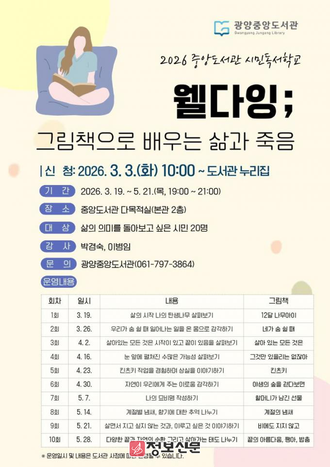 ![]() 광양중앙도서관, 상반기 시민독서학교 수강생 모집 |