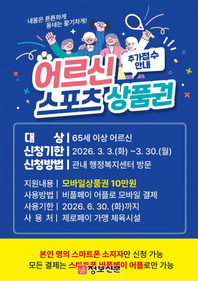 ![]() 목포시, 어르신 스포츠 상품권 추가 접수 실시 |