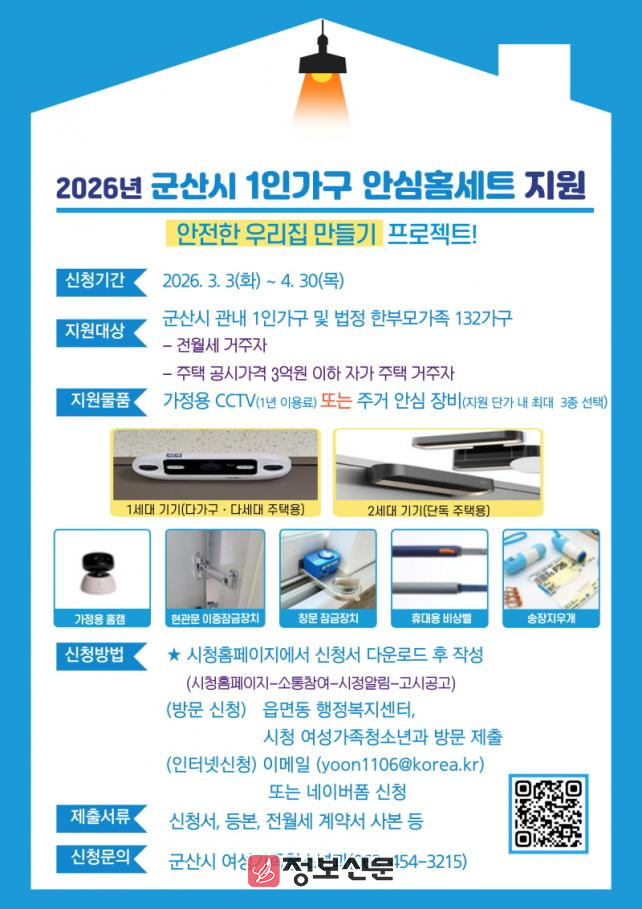 ![]() 군산시, 2026년 1인 가구 안심홈세트 지원사업 접수 시작 |