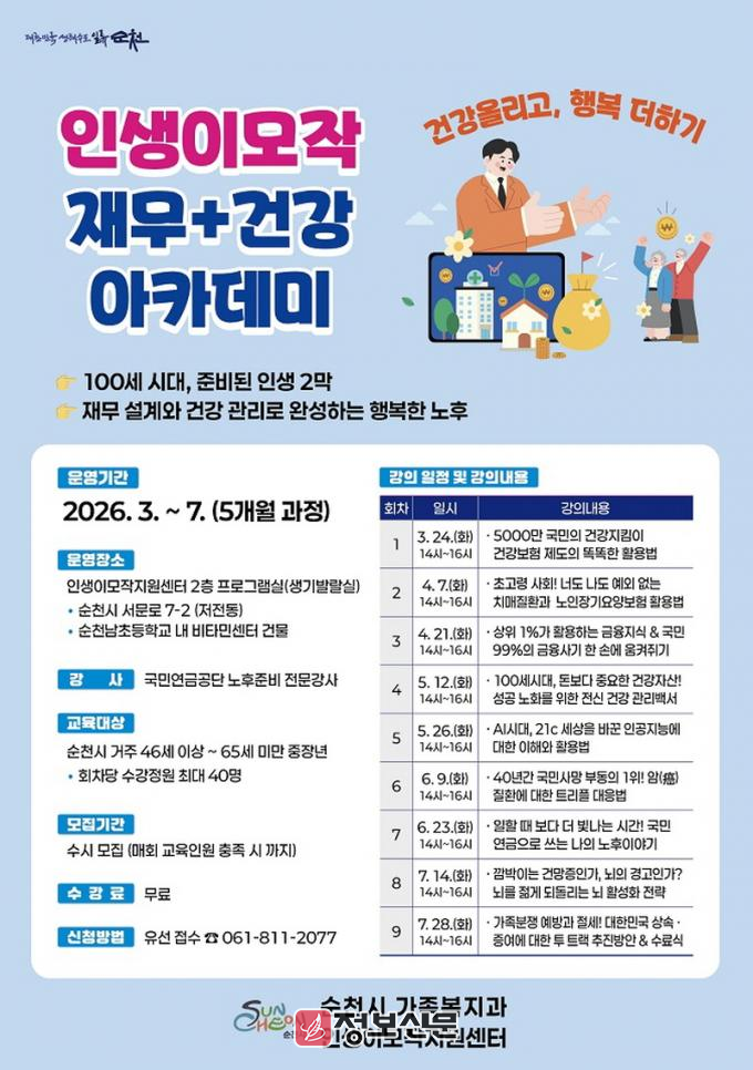 ![]() 순천시 인생이모작지원센터, 재무.건강 아카데미 수강생 모집 |