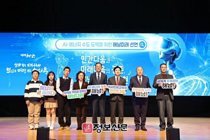 해남군과 해남교육지원청은 27일 해남문화예술회관 대공연장에서‘AI·에너지 수도 도약을 위한 해남미래 선언식’을 개최했다. 이날 행사에는 교육공동체와 주민 등 600여명이 참석해 AI·에너지 수도 도약을 준비하는 미래 비전을 공유했다.