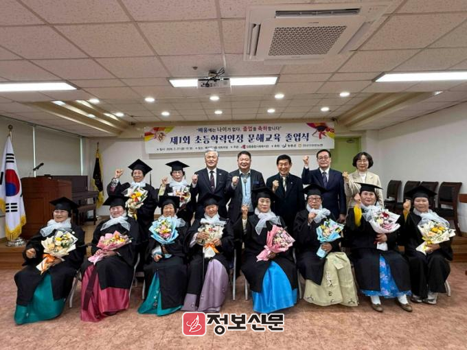 이번 졸업식에서는 배움의 기회를 놓쳤던 어르신 12명이 3년간 한글 읽기·쓰기와 기초 문해 교육과정을 성실히 이수하고 초등 학력 인정서를 받았다. 특히 우수한 성적으로 과정을 마친 졸업생 2명에게는 교육장 상장이 수여돼 의미를 더했다.