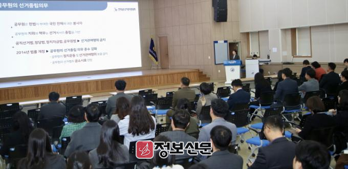 이번 교육은 공무원의 정치적 중립의무를 재확인하고, 선거 관련 법령 이해를 높여 선거법 이해 부족으로 발생할 수 있는 위반 사례를 사전에 예방하기 위해 마련됐다.