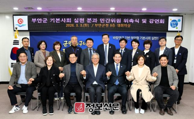 부안군은 3일 군청 대회의실에서 군정조정위원회 바람연금 기반 기본사회 실현분과 민간위원 위촉식과 전문가 강연을 개최했다.