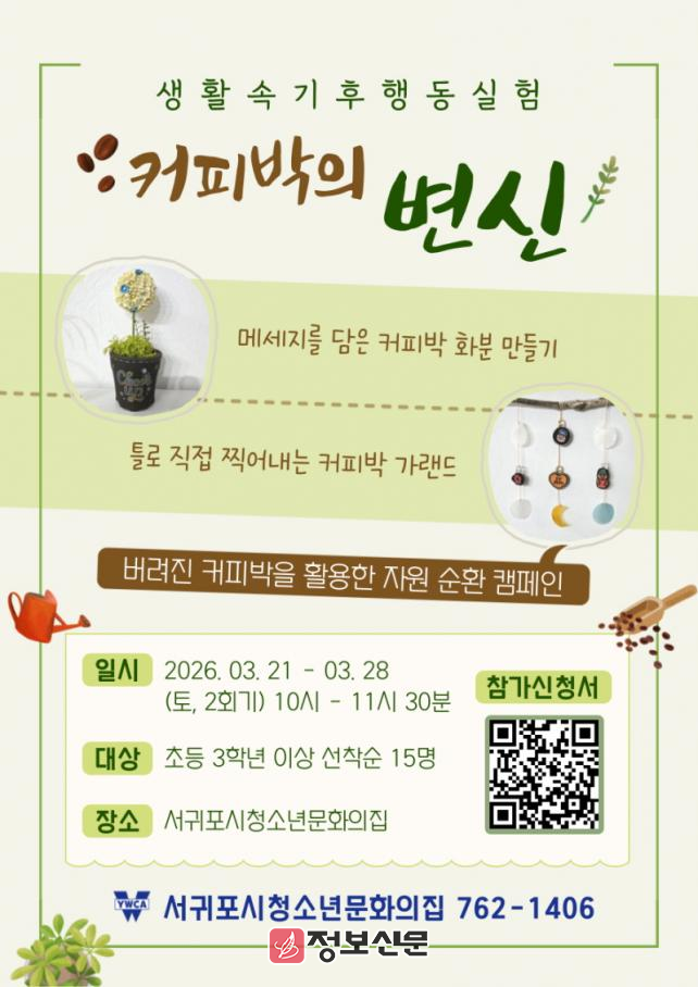 ![]() 서귀포시청소년문화의집, 생활 속 기후행동 실험: 커피박의 변신 프로그램 참가자 모집 |