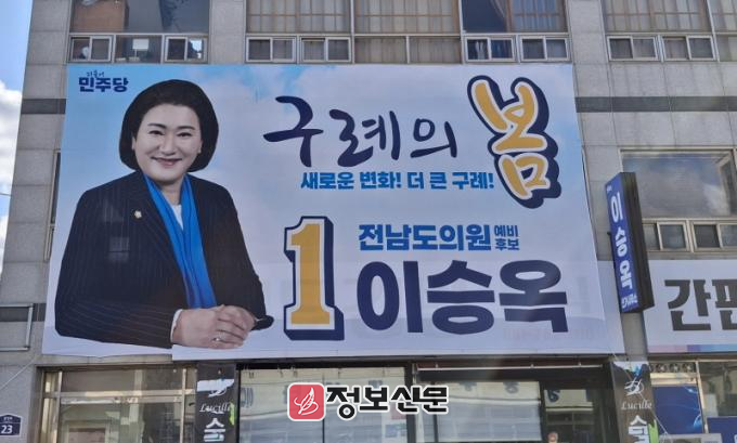 ![]() 이승옥 전남도의원 예비후보, ‘구례의 봄’ 대형 현수막 게시 선거운동 본격 행보 |