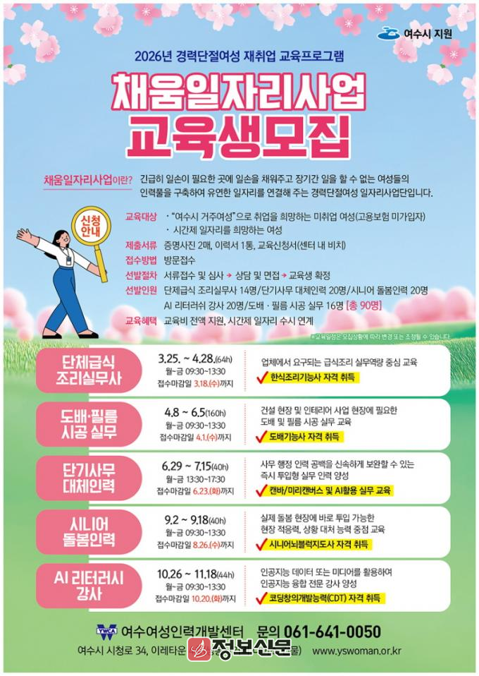 과정별 접수 마감일과 교육 일정은 상이하며, 자세한 사항은 여수여성인력개발센터(☎061-641-0050)로 문의하면 된다.