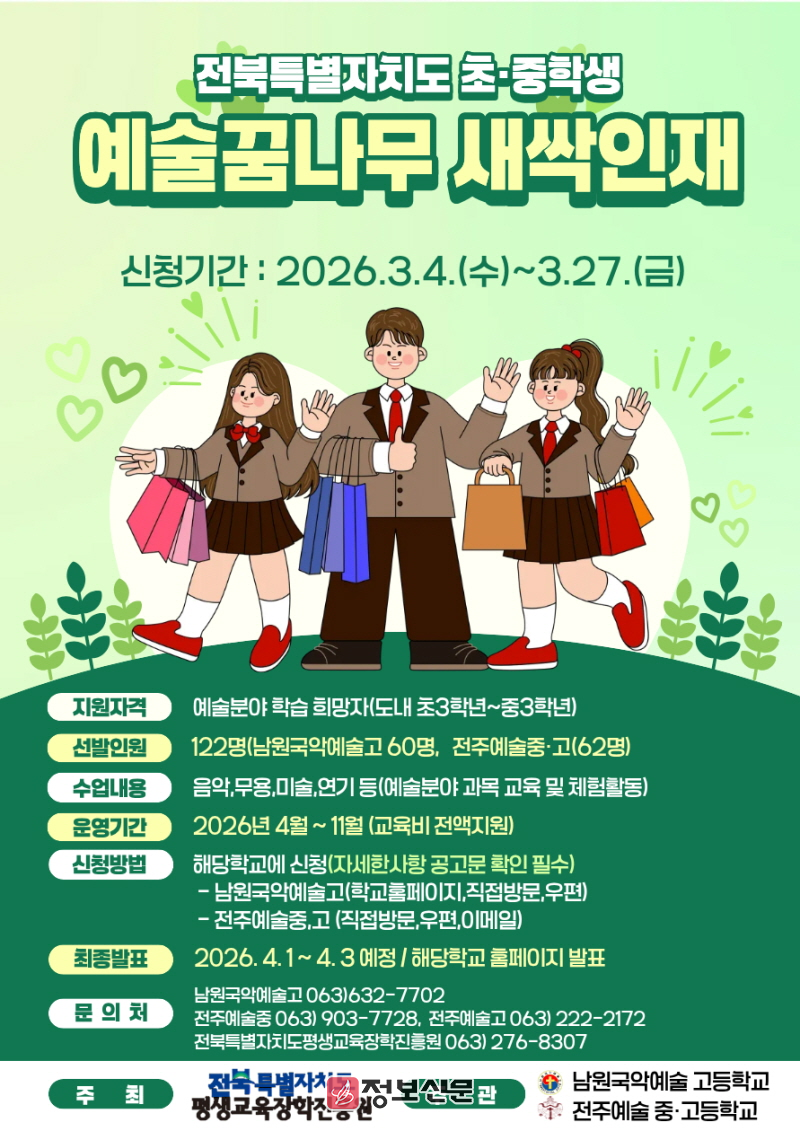 ![]() 전북특별자치도평생교육장학진흥원, 2026년 예술꿈나무 새싹인재 육성사업 참여학생 모집 |