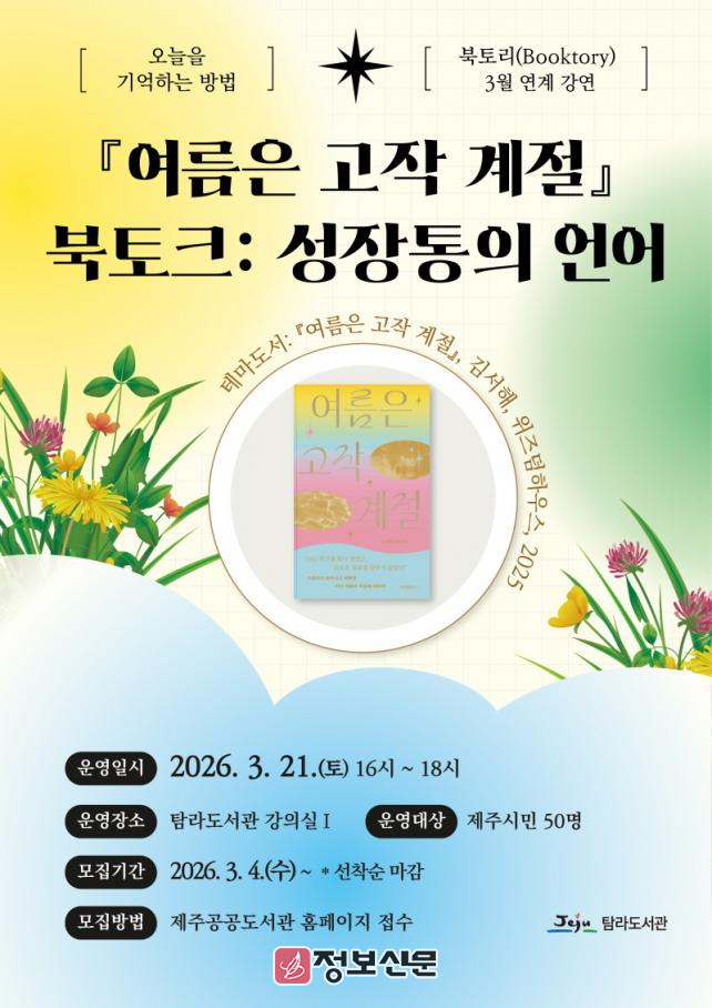 이번 강연은 주제 도서의 저자인 김서해 작가가 ‘북토크: 성장통의 언어’를 주제로 오는 3월 21일(토) 오후 4시 탐라도서관 강의실에서 진행한다.