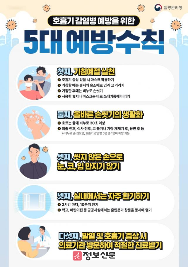 아울러 일상 속 감염병 예방을 위해 △비누로 30초 이상 손씻기 △기침 예절 실천 △실내 자주 환기 △호흡기 증상 시 마스크 착용 및 신속한 진료 등 기본적인 개인위생 수칙을 철저히 지켜줄 것을 당부했다.