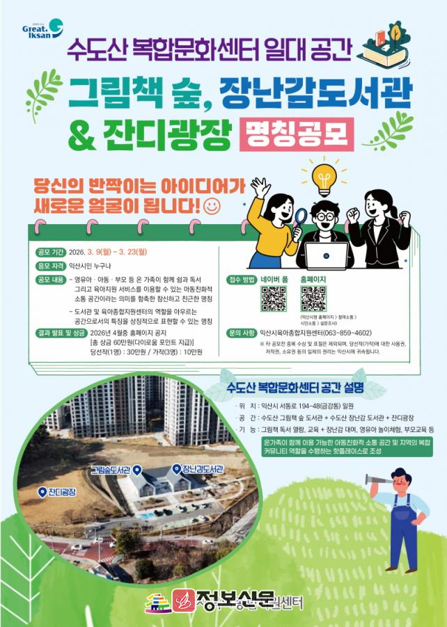 익산시 관계자는 "수도산 복합문화센터 일대 공간은 아이들이 마음껏 뛰어놀고 부모들이 편히 소통할 수 있는 익산시 아동친화 정책의 핵심 거점이 될 것"이라며 "시민들의 애정과 관심이 담긴 이름이 지어질 수 있도록 적극적인 참여를 부탁드린다"고 전했다.
