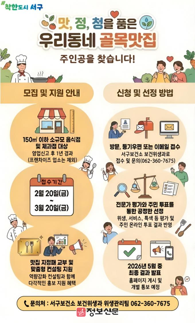 올해는 서구 관내 소규모 음식점과 제과점을 대상으로 진행되며 서류 심사와 현장 조사, 온라인 주민 투표, 전문가 심의를 거쳐 위생·맛·서비스·향토성 등을 종합 평가해 최종 16개소 내외를 선정할 계획이다.