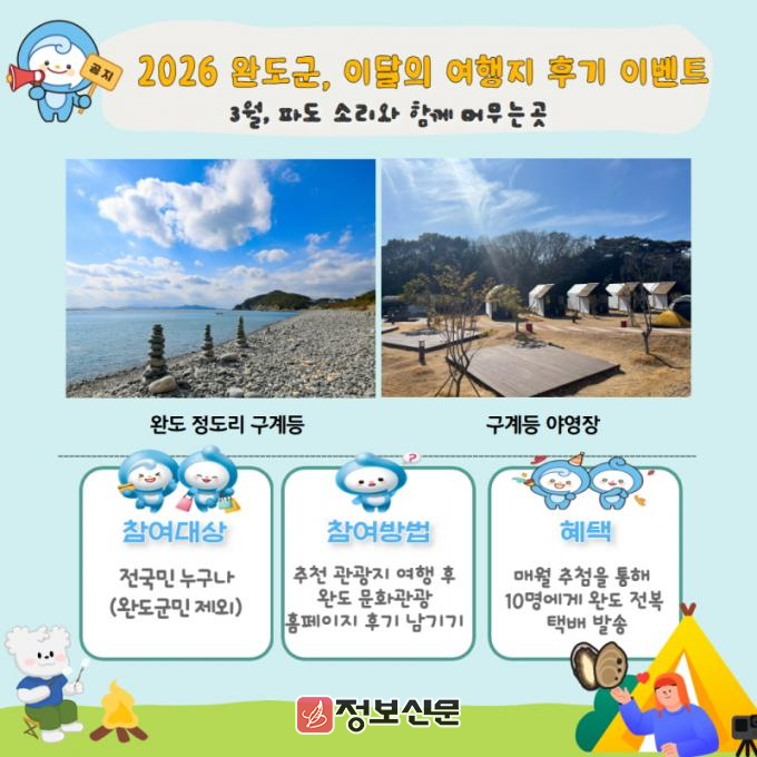 완도군은 관광객들에게 다양한 혜택을 제공하고 완도 관광지·특산품 홍보를 위해 3월부터 12월까지 월별 추천 관광지를 방문하고 후기를 남기면 특산품을 증정하는 ‘완도, 열두 달의 설렘’ 이벤트를 진행한다.