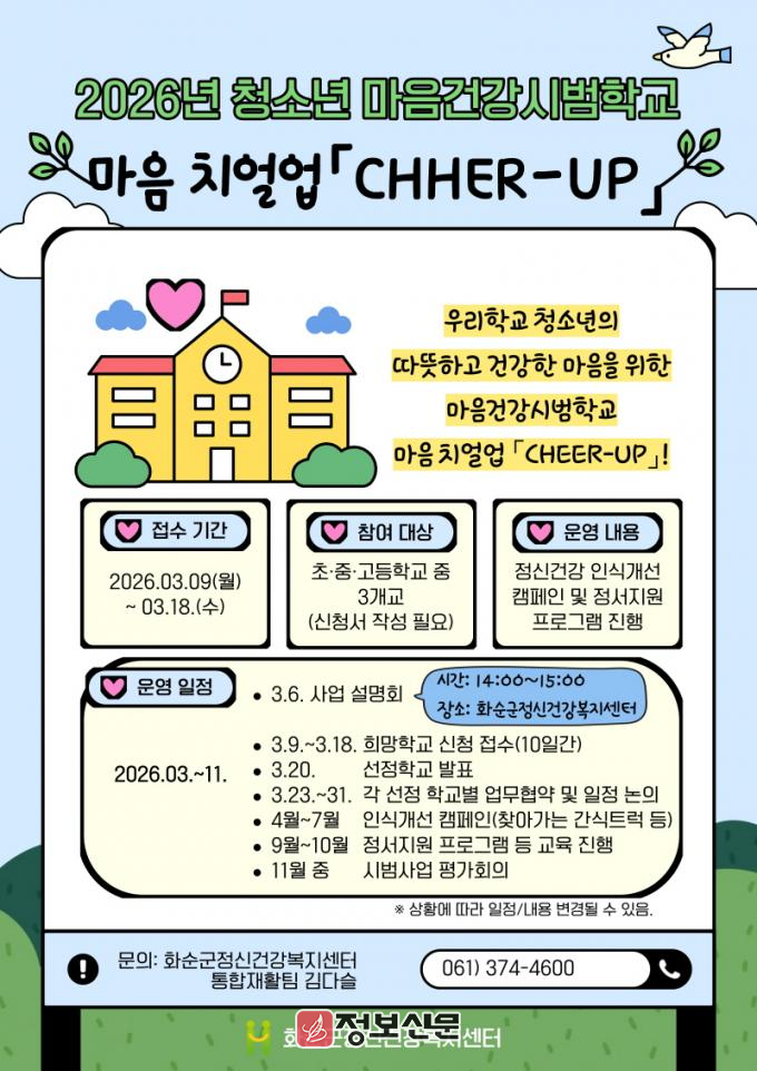 ![]() 화순군정신건강복지센터, 2026년 청소년 마음건강시범학교 운영 |