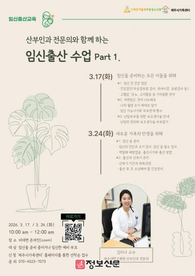 제주시 안진숙 여성가족과장은 “임신과 출산은 가족의 시작을 준비하는 중요한 과정인 만큼, 신뢰할 수 있는 전문가의 교육을 통해 예비 부모들의 궁금증을 해소하는 소중한 시간이 되기를 바란다”고 밝혔다.