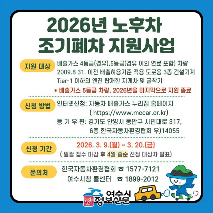 ![]() 여수시, 노후차 조기폐차 지원사업 추진 |