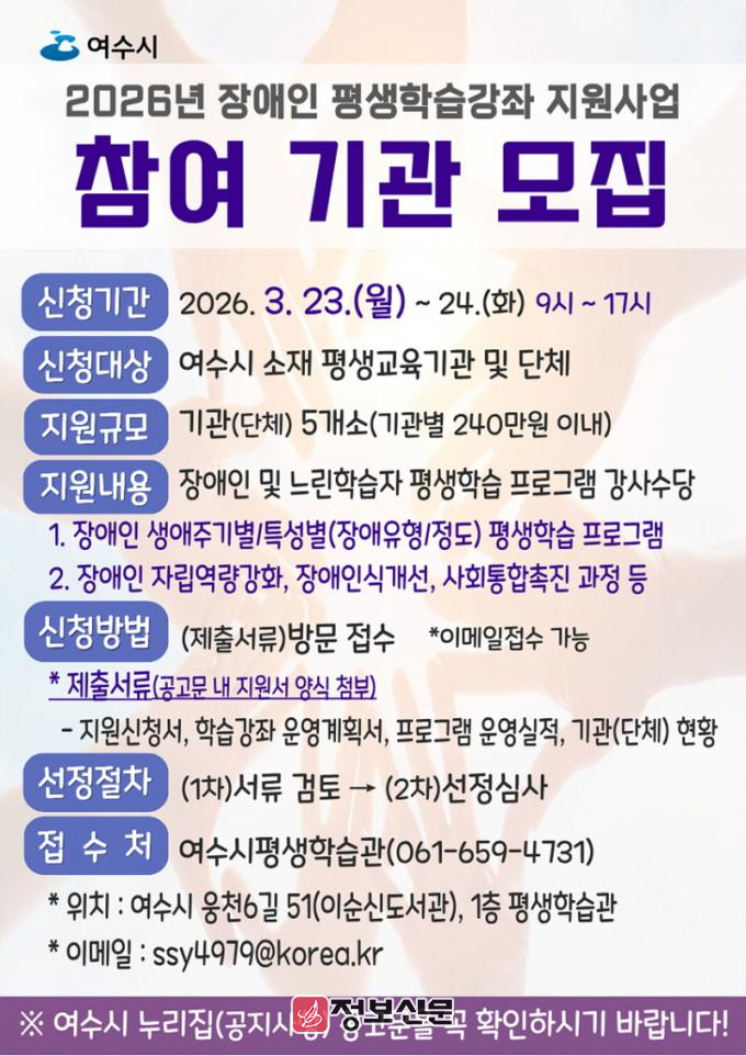 ![]() 여수시, ‘장애인 평생학습강좌 지원사업’ 참여기관 모집 |