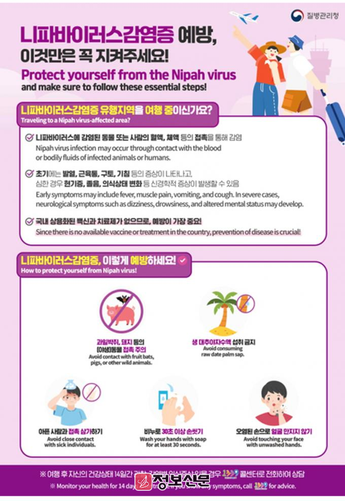 특히 치명률이 높고 백신과 치료제가 아직 개발되지 않은 ‘니파바이러스감염병’이 최근 법정 제1급 감염병으로 지정되면서 해외 감염병에 대한 경각심이 더욱 요구되고 있다.