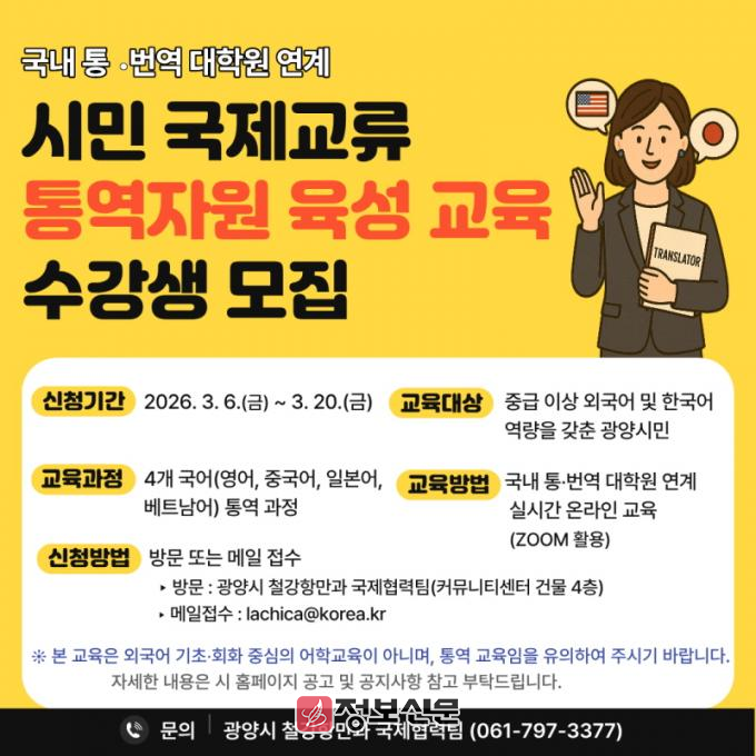 ![]() 광양시, 시민 외국어 통역자원 육성 교육 수강생 모집 |