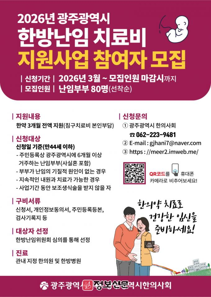 ![]() 광주광역시, 2026년 한방 난임부부 한방치료비 지원사업 시행 |