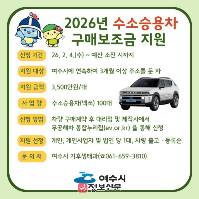 신청 기한은 3월 20일까지며 자동차 배출가스 종합전산시스템(www.mecar.or.kr)을 통한 온라인 신청과 여수시청 기후생태과로 방문 또는 등기우편 신청이 가능하다.