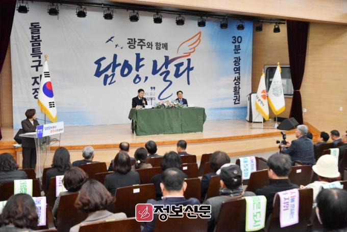 이어 진행된 2부 질의응답 및 의견청취 시간에서는 북광주IC 일대 부지 활용 방안과 농촌지역 그린벨트 해제 필요성, 담양-광주 버스노선 운영 확대, 달빛철도 신속 추진 및 담양역 경전철 연계 방안 등이 논의됐다.