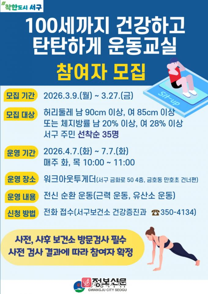 서구는 오는 27일까지 참여자 35명을 선착순 모집한다. 참여 대상은 체지방률이 남성 20%, 여성 28% 이상인 서구 주민이며 참여 희망자는 서구보건소 건강증진팀(062-350-4134)으로 신청하면 된다.