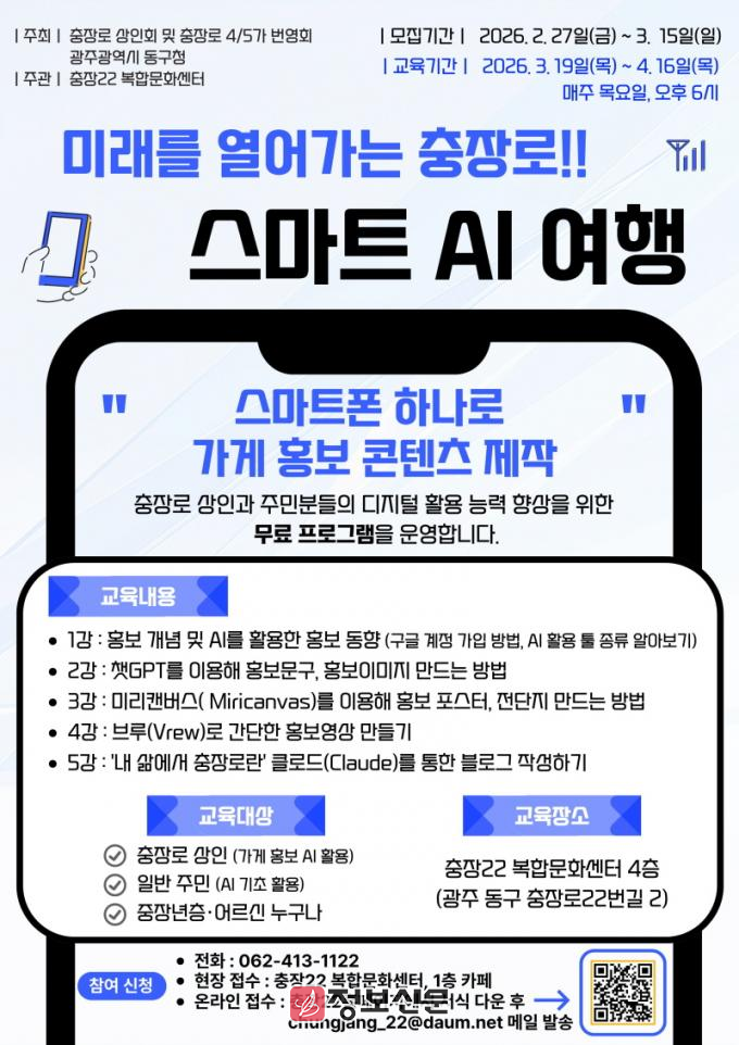 모집 기간은 15일까지이며, 충장로 상인(가게 홍보용 AI 활용을 원하는 상인), 일반 주민(AI 기초 활용 희망자), 중장년 및 어르신 등 관심 있는 누구나 신청할 수 있다.