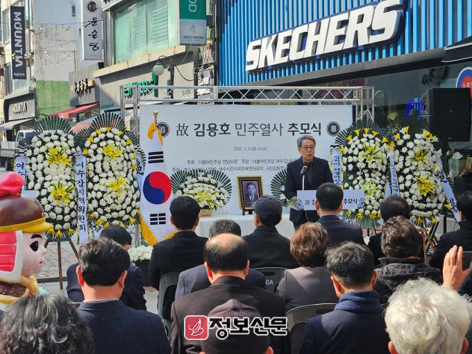 故김용호 열사는 1960년 이승만 자유당 독재정권에 항거하며 민주주의 수호 운동을 펼친 인물이다. 민주당 여수시당 문화부장이자 여수일보 경리부장이던 그는 3월 9일 옛 민주당사(현 중앙동 일원)에서 괴한 습격을 받아 33세의 젊은 나이에 생을 마감했다.