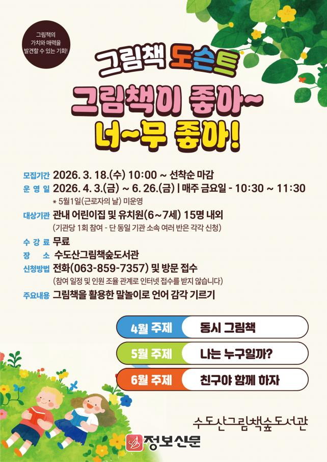 프로그램은 4월부터 6월까지 매주 금요일 운영되며, 참여를 원하는 어린이집과 유치원은 오는 18일 오전 10시부터 도서관에 방문하거나 전화(063-859-7357)로 신청하면 된다.