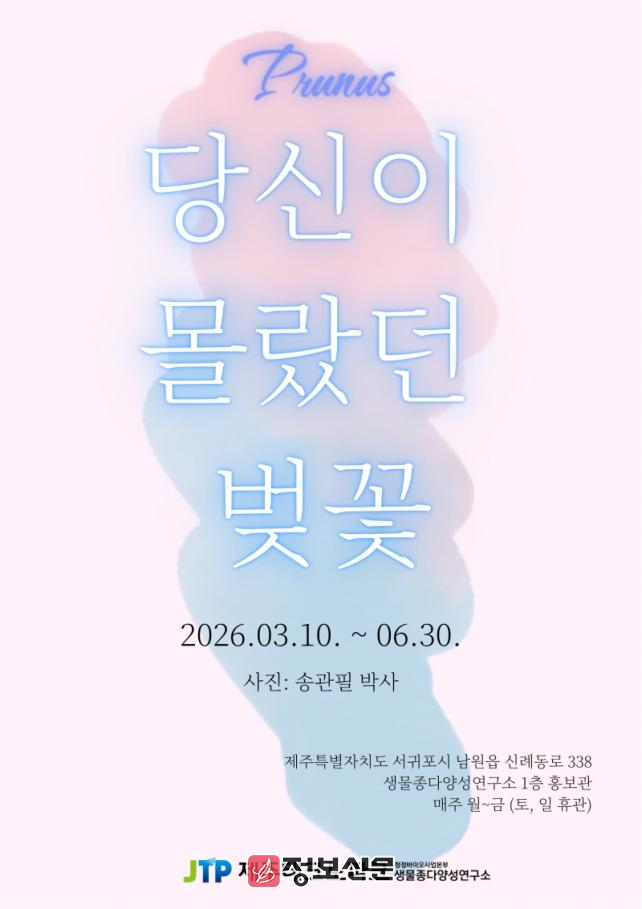 제주테크노파크(원장 지영흔, 제주TP) 청정바이오사업본부 생물종다양성연구소는 오는 6월 30일까지 서귀포시 남원읍 생물종다양성연구소 1층 홍보관에서 제주 자생 벚나무의 생태적 가치를 조명하는 ‘당신이 몰랐던 벚꽃’ 사진전을 개최한다고 10일 밝혔다.