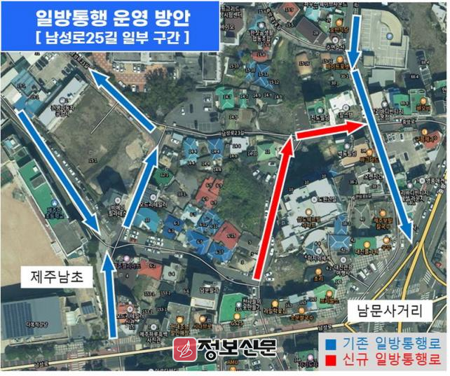 이에 지역 주민들은 여러 논의 끝에 남성로25길 일부 구간(125m)에 대한 일방통행 지정을 요청했으며, 제주시는 지난해 주민주도형 일방통행로 조성 절차에 따라 주민 의견수렴, 교통시설심의회 심의, 유관기관(부서) 협의, 일방통행 지정 행정예고 등 사전 절차를 마무리했다.