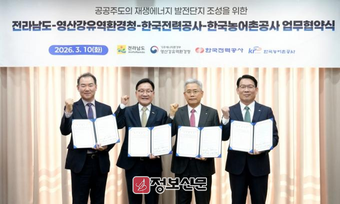 전남도는 사업 발굴과 계획 수립, 주민 수용성 확보 등 행정 지원을 맡고, 영산강유역환경청은 규제와 제도 개선 지원, 환경성을 고려한 전력망 확충 지원 등에 나서며, 한국전력은 재생에너지 안정적 공급을 위한 변전소와 송전선로 적기 건설을 추진하고, 한국농어촌공사는 농업기반시설을 활용한 단지 조성을 지원하는데 협력하기로 했다.
