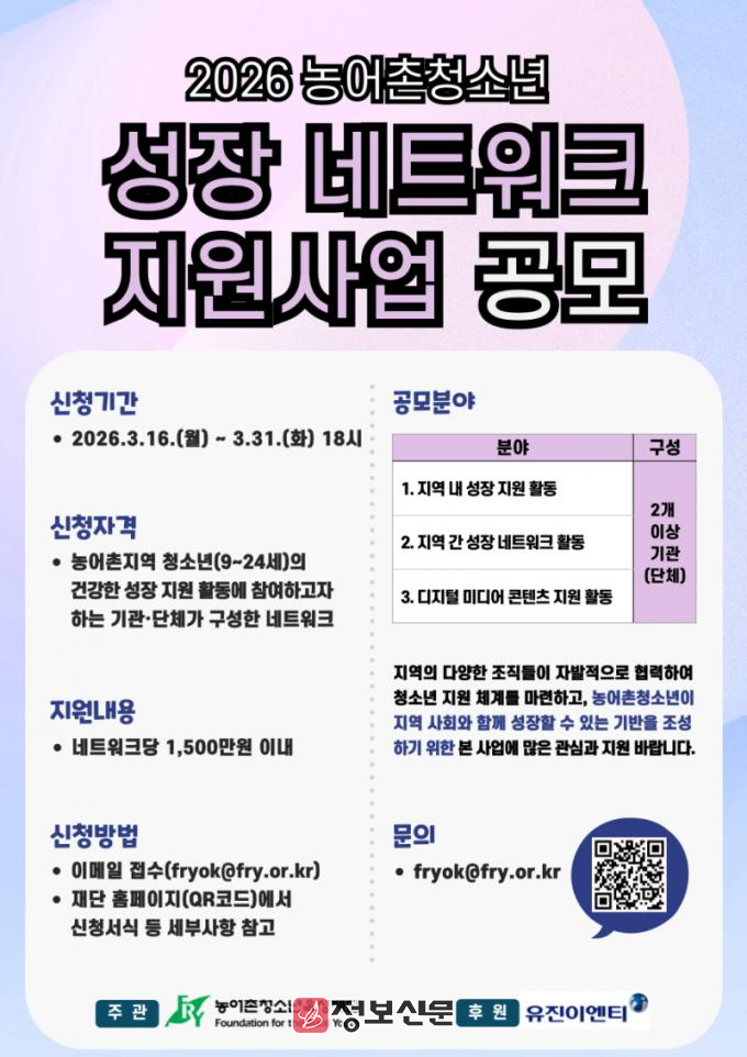 ![]() 농어촌청소년육성재단, 2026 농어촌청소년 성장 네트워크 지원사업 공모 |