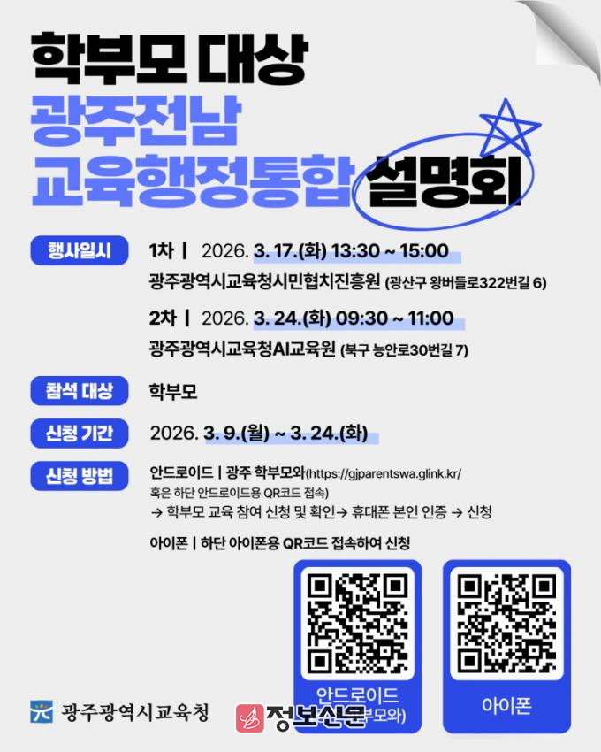 ![]() 광주광역시교육청, 학부모 대상 광주.전남 교육행정통합 설명회 개최 |