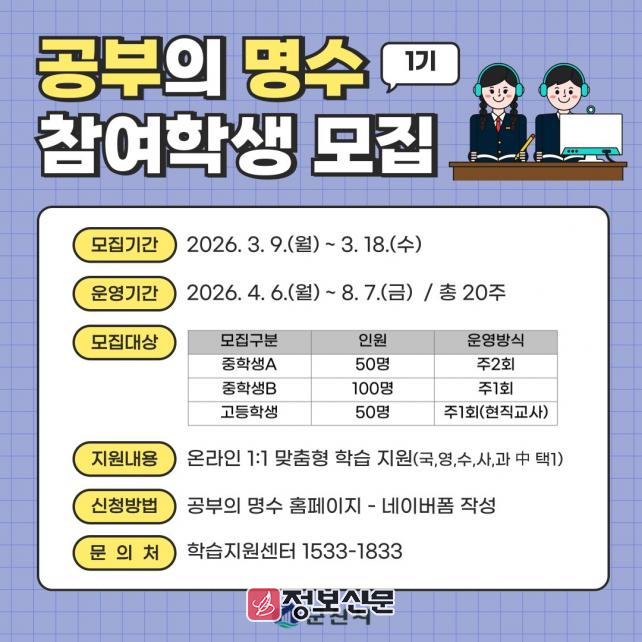 ![]() 군산시, ‘공부의 명수’ 온라인 튜터링 1기 참여학생 모집 |