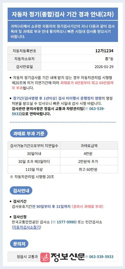 ![]() 정읍시, 자동차 검사·보험 안내 ‘모바일 전자고지’ 13일 본격 시행 |