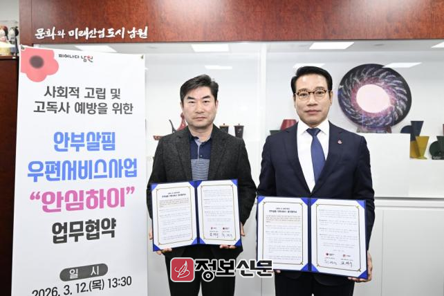 시는 12일 시장실에서 남원우체국과 ‘2026년 안부살핌 우편서비스 사업’ 추진을 위한 업무협약을 체결하고, 위기가구 발굴 및 지원을 위한 민관 협력체계를 강화하기로 했다.